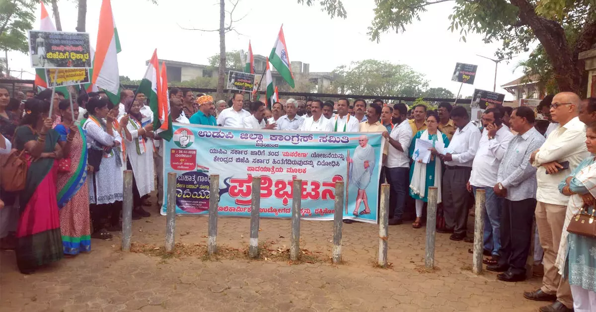 Udupi District Congress held a protest march from Manipal to the DC office against the withdrawal of the MGNREGA scheme. Leaders warned of an intensified struggle if the pro-poor project is not reinstated.
